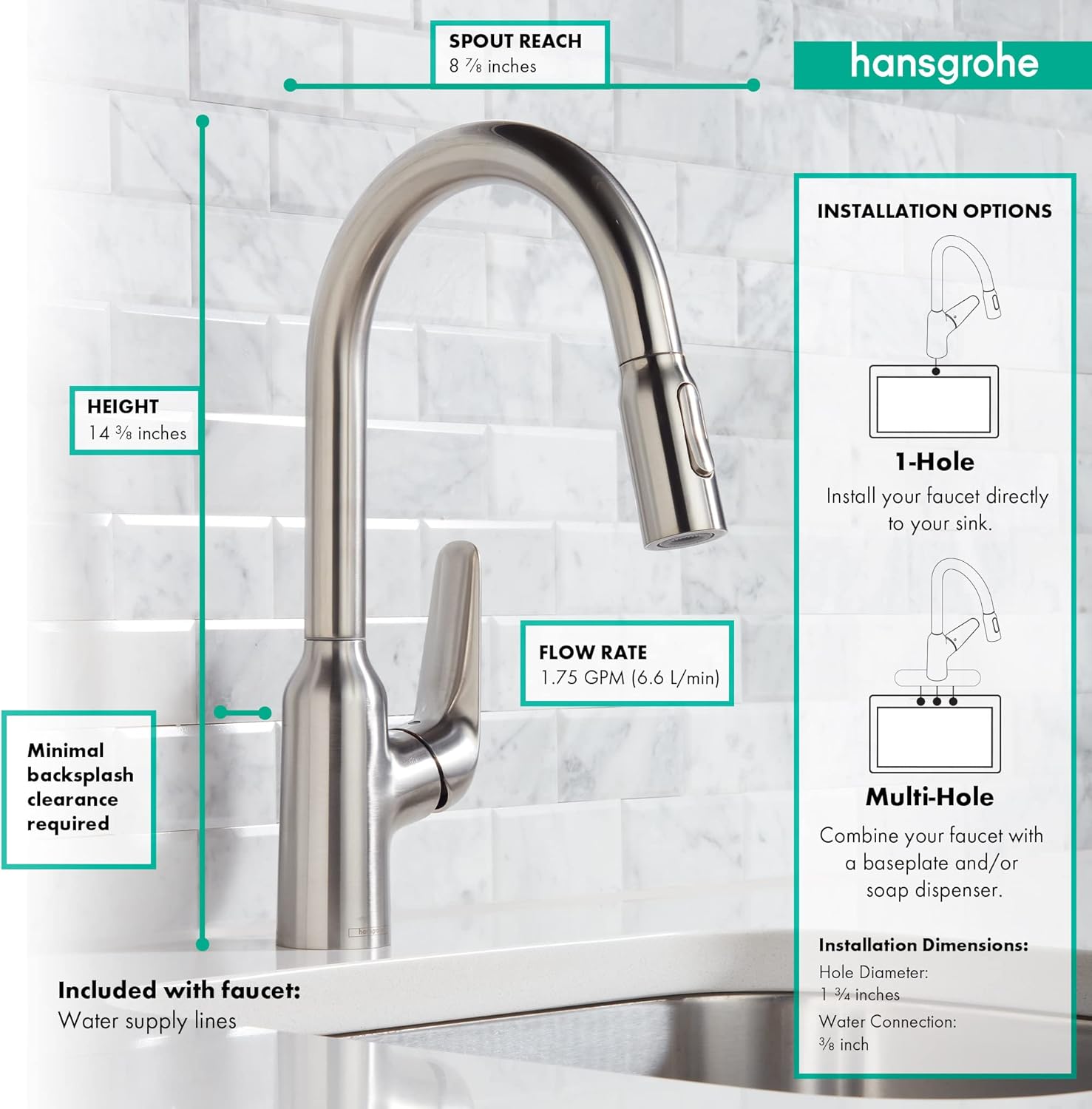 The Hansgrohe Focus N Pull-Out Kitchen Faucet offers timeless design and quality that will enhance any kitchen space. Its modern functionality, stainless steel look, and innovative features such as the pull-out spray and magnetic holder make it a convenient and stylish choice for any home. With easy installation and a limited lifetime warranty, this faucet provides peace of mind and long-lasting performance. For a sleek and efficient addition to your kitchen, the Hansgrohe Focus N Pull-Out Kitchen Faucet is a top-notch choice that will elevate your daily kitchen tasks. Hansgrohe recommends a licensed plumber install this product for optimal performance and functionality.