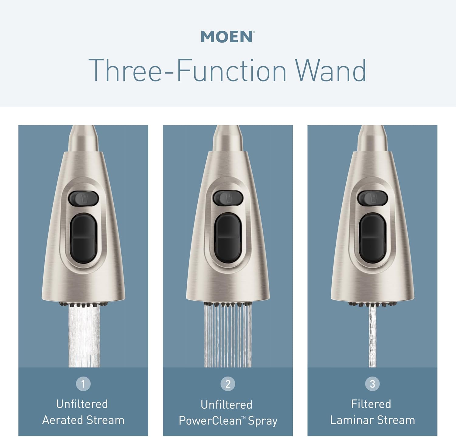 Enjoy the confidence of knowing your tap water is clean and safe to drink with Moen’s 3 -in-1 Water Filtration Pulldown Kitchen Faucets. These pulldown kitchen faucets dispense filtered cold water, and hot and cold tap water through two separate water channels, eliminating any chance of mixed water flow. For drinking and cooking, flip the button on the spray head for filtered water; use the lever handle handle for tap water. Environmentally friendly, Moen 3 in 1 Water Filtration Kitchen Faucets put filtered water at your fingertips, eliminating reliance on plastic water bottles, heavy jugs, and bulking external filters. This faucet can be paired with Moen water filtration system (sold separately) to meet your home’s needs.