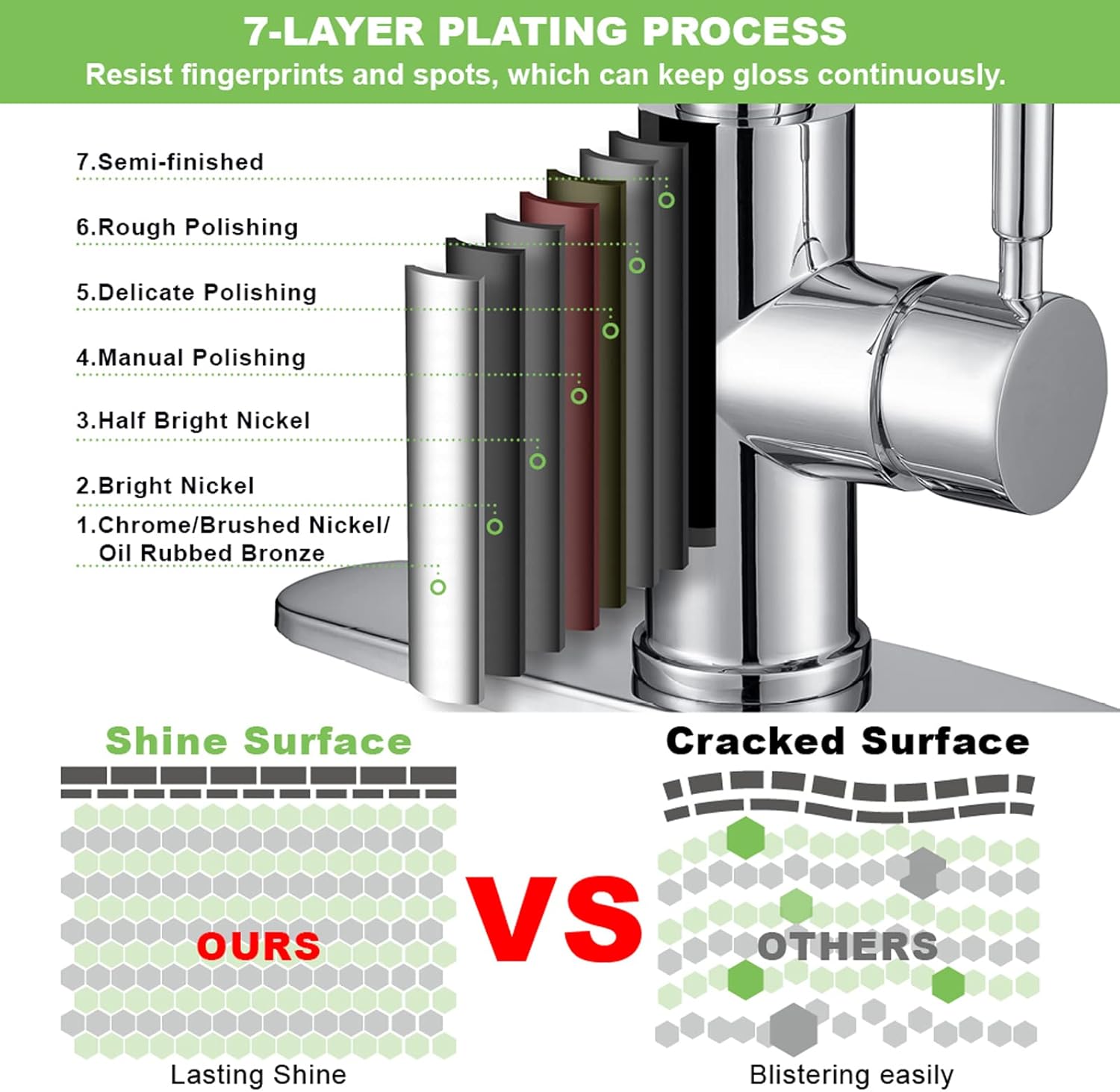 The WEWE Polished Chrome Single Handle Kitchen Faucet is built to last with its 7-layer deep plating metal finish. Not only does this finish resist fingerprints and spots, but it also keeps your faucet looking shiny and new for years to come. Say goodbye to constantly polishing your faucet and enjoy a low-maintenance, high-quality fixture in your kitchen.