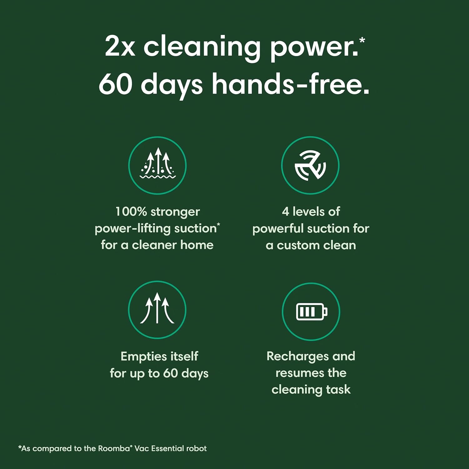 – 2x cleaning power compared to the Roomba Essential robot