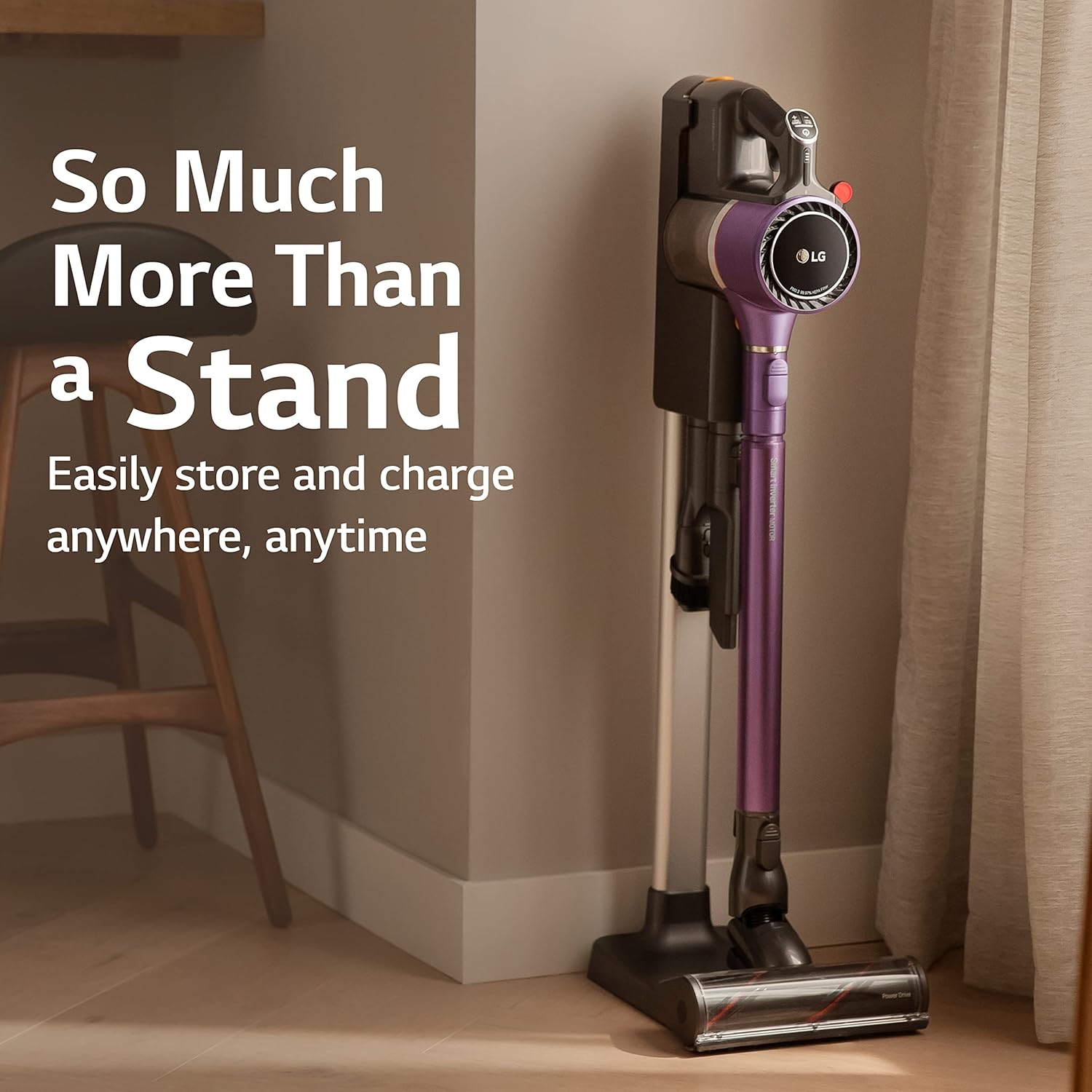 With two rechargeable, detachable batteries, the **LG CordZero A9** delivers up to **120 minutes** of uninterrupted cleaning performance. Clean and charge at the same time with the portable charging stand that can be placed anywhere in your home without the need to drill holes in your walls. Say goodbye to constantly searching for outlets and hello to convenient and efficient cleaning with the **LG CordZero A9**.